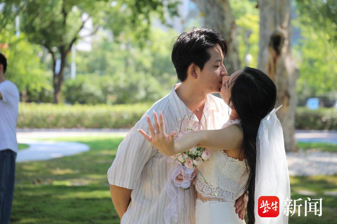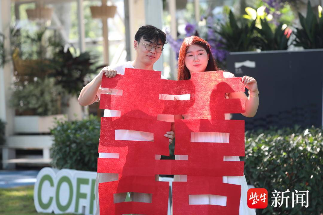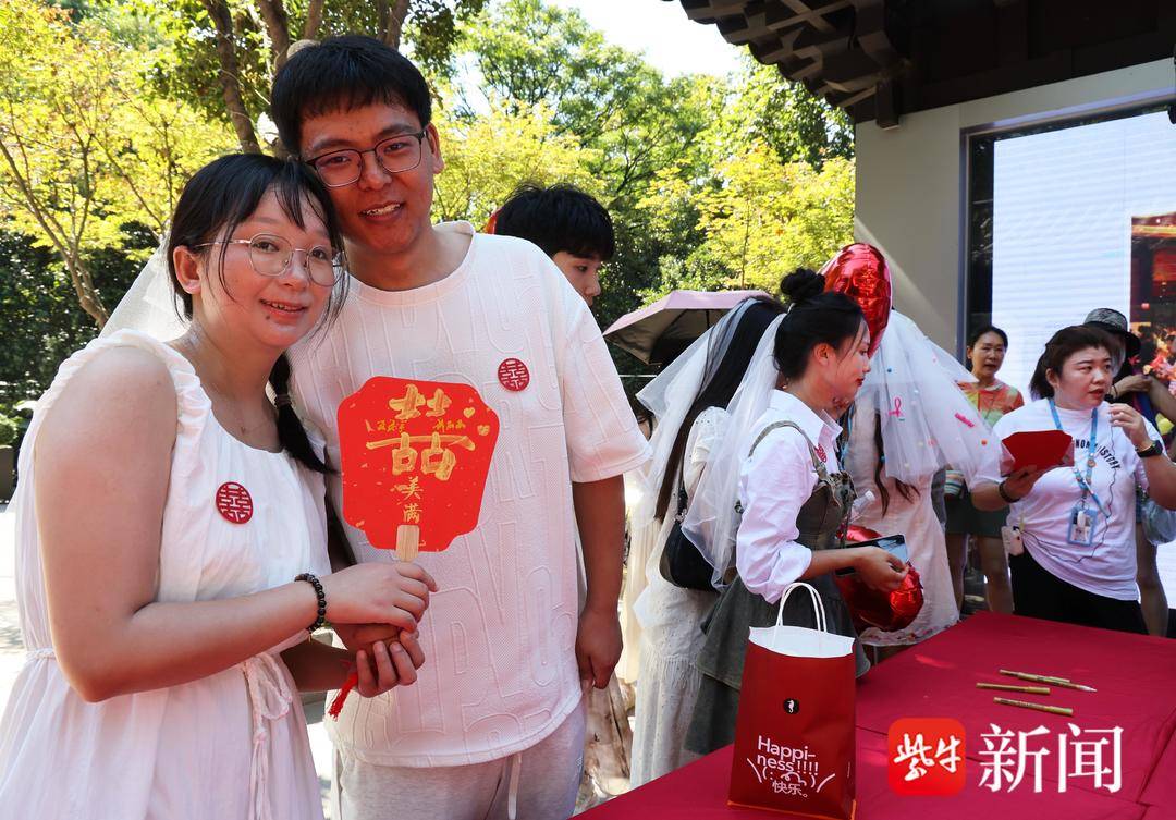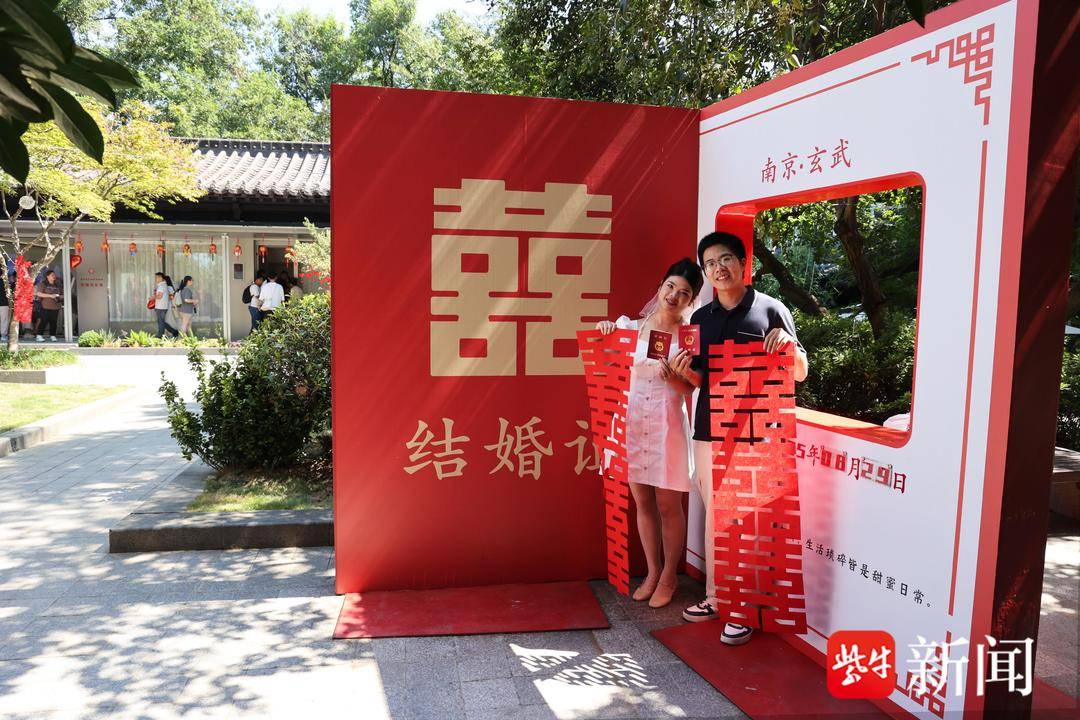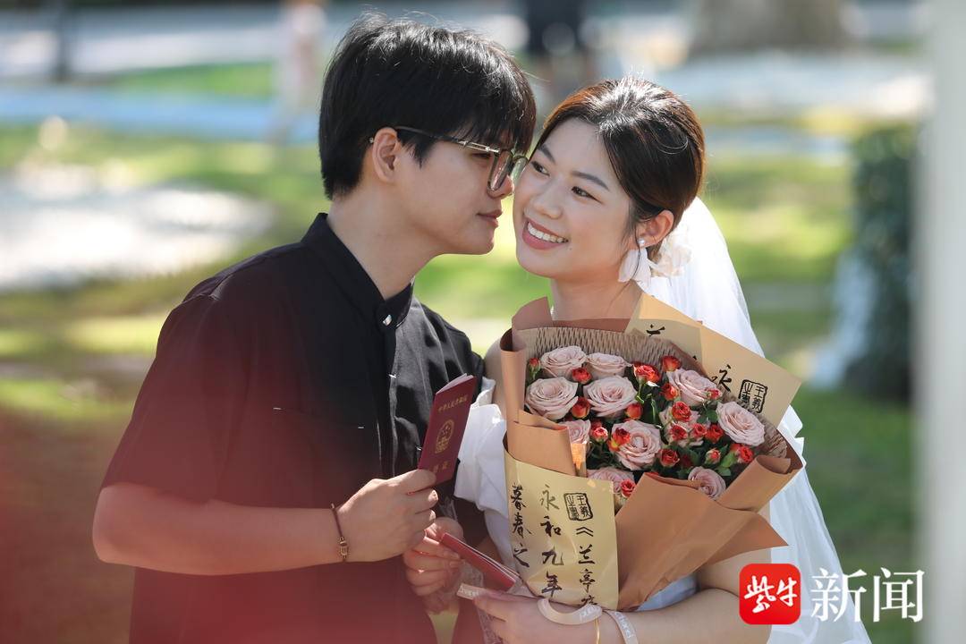 记者看到,每对完成领证的新人均可领取一份甜蜜双重礼,内含喜相逢福利彩票和孩子王赠送的火烈鸟游船船票,寓意“百年修得同船渡,欣喜相逢结良缘”。10时,记者遇到了刚领完结婚证的重庆小伙小陈和山西姑娘小刘。小陈告诉记者,将人生重要仪式定于此处,不仅因玄武区是两人共同生活的地方,更因这里承载着他们相识、相恋的美好回忆。两人均毕业于南京理工大学,小陈为博士,小刘为硕士,在工作过程中相知相爱。小刘笑着透露:“其实是我先表白的。”谈及未来,她许下朴实而温暖的心愿:“希望我们健康、平安,一直快乐顺遂!”小陈也深情地说道:“今天是一个值得铭记的日子。愿我们往后彼此包容、互相扶持,携手共度一生。”