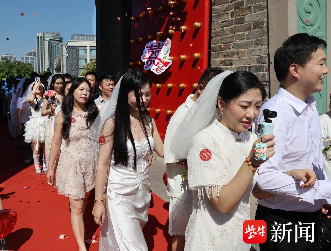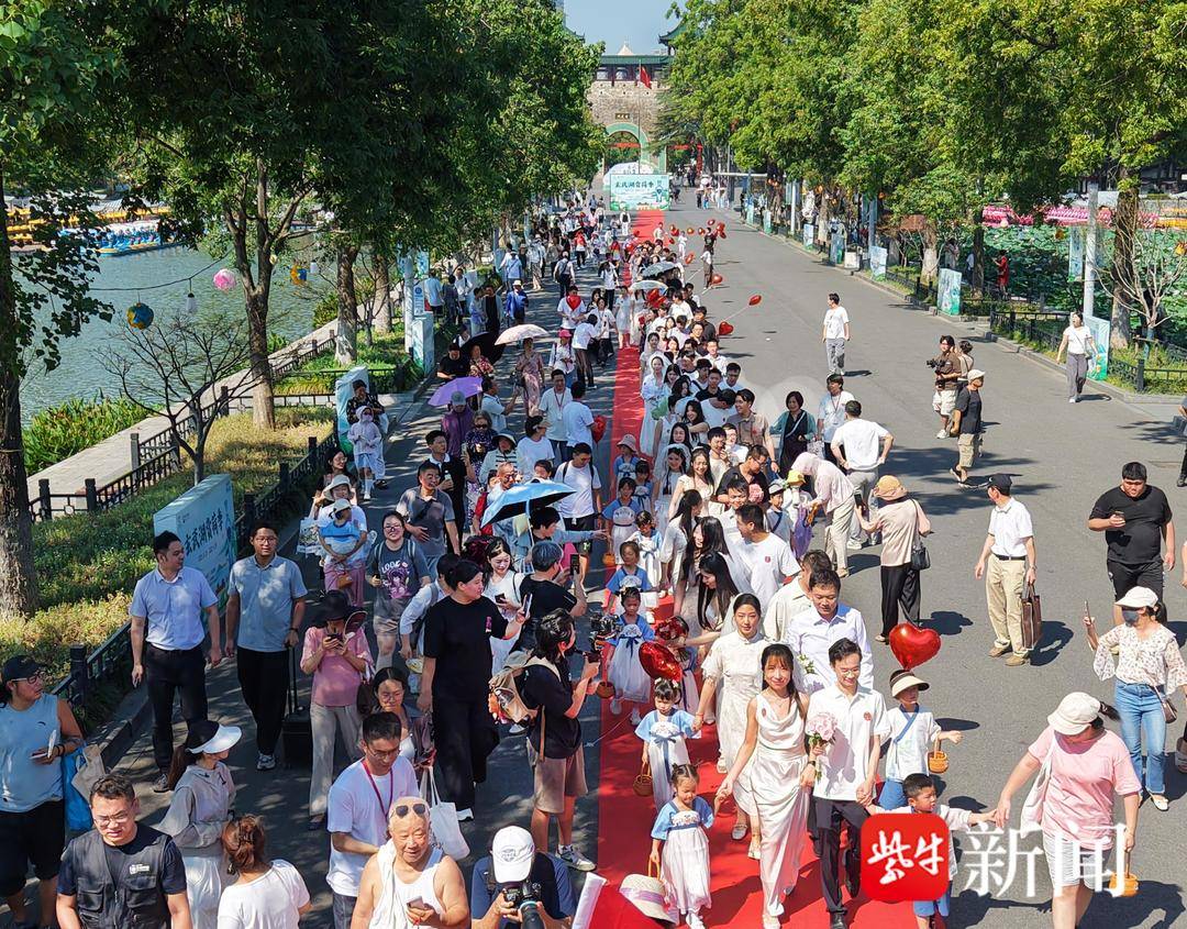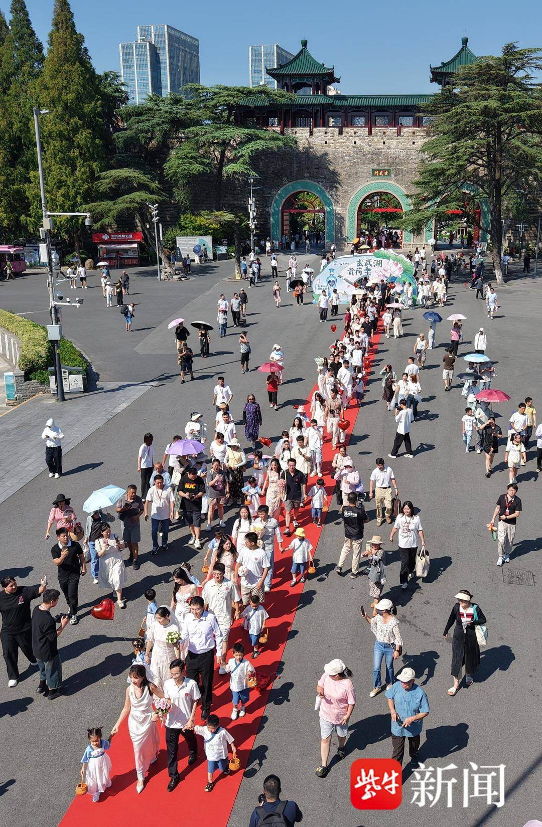 8月29日9时,玄武湖公园玄武门中门前,近百对新人挽手站定,伴随着声声喜庆的锣鼓,由20位小花童引领穿越百年门楼,入目是湖光潋滟的美景,身侧是执手相伴的爱人,脚下是通往幸福的红毯。不远处,一座由桂花糕叠成的“步步糕”塔散发着甜甜香气,这是为新人们准备的“甜蜜关卡”,新人携手“登糕”寓意“爱情甜蜜蜜,生活步步高”。婚姻登记处前还精心设置了爱心拱门,与结婚证打卡立牌相映成趣,可供新人拍照留念,记录下珍贵的人生时刻。