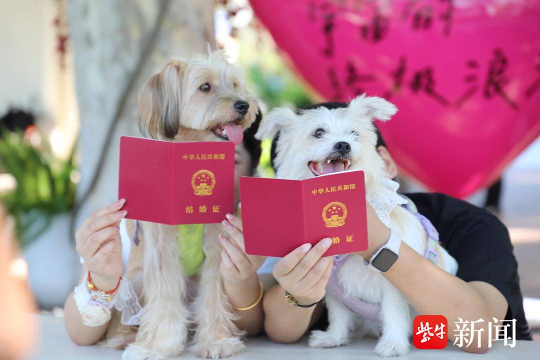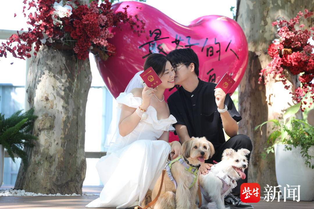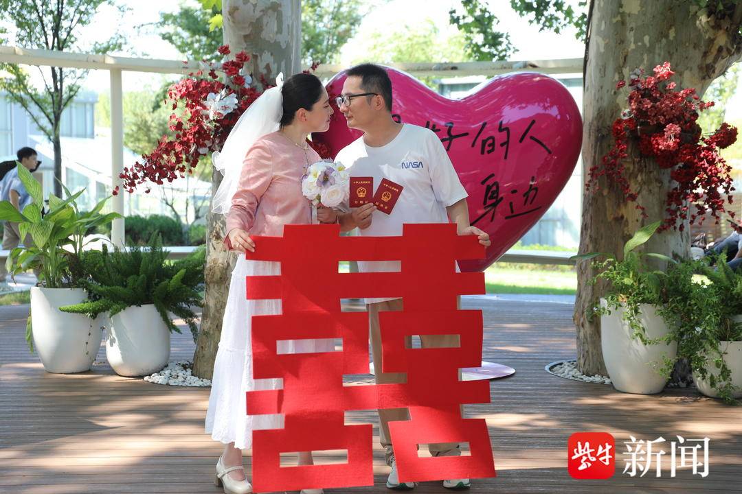 刚领完证的新人在玄武区民政局金陵浪漫中心结婚登记处拍照打卡。徐福庚 摄